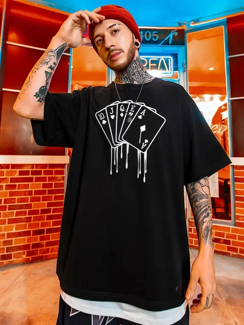 تي شيرت كاجوال برقبة قصيرة أكمام قصيرة بياقة طاقم مطبوع عليها بطاقة رجالي كبير الحجم – أسود