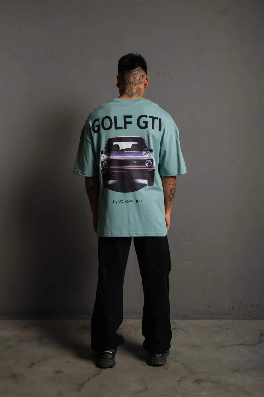 تي شيرت مطبوع كبير الحجم للرجال – تي شيرت غولف جي تي آي مطبوع بنقشة سيارة ريترو، طباعة رقمية من الأمام والخلف، تصميم أزياء الشارع – أخضر نعناعي