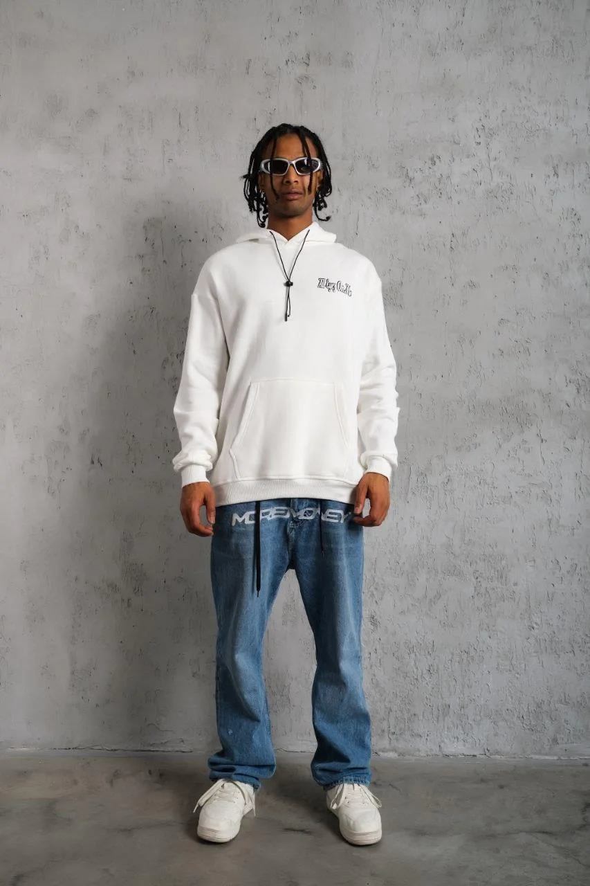 سترة رياضية رجالية بقصة فضفاضة وقلنسوة ثلاثية الخيوط – بأساور مضلعة على الأكمام والحاشية، وطباعة على الصدر والظهر، وجيب الكنغر، وتصميم مريح – أبيض