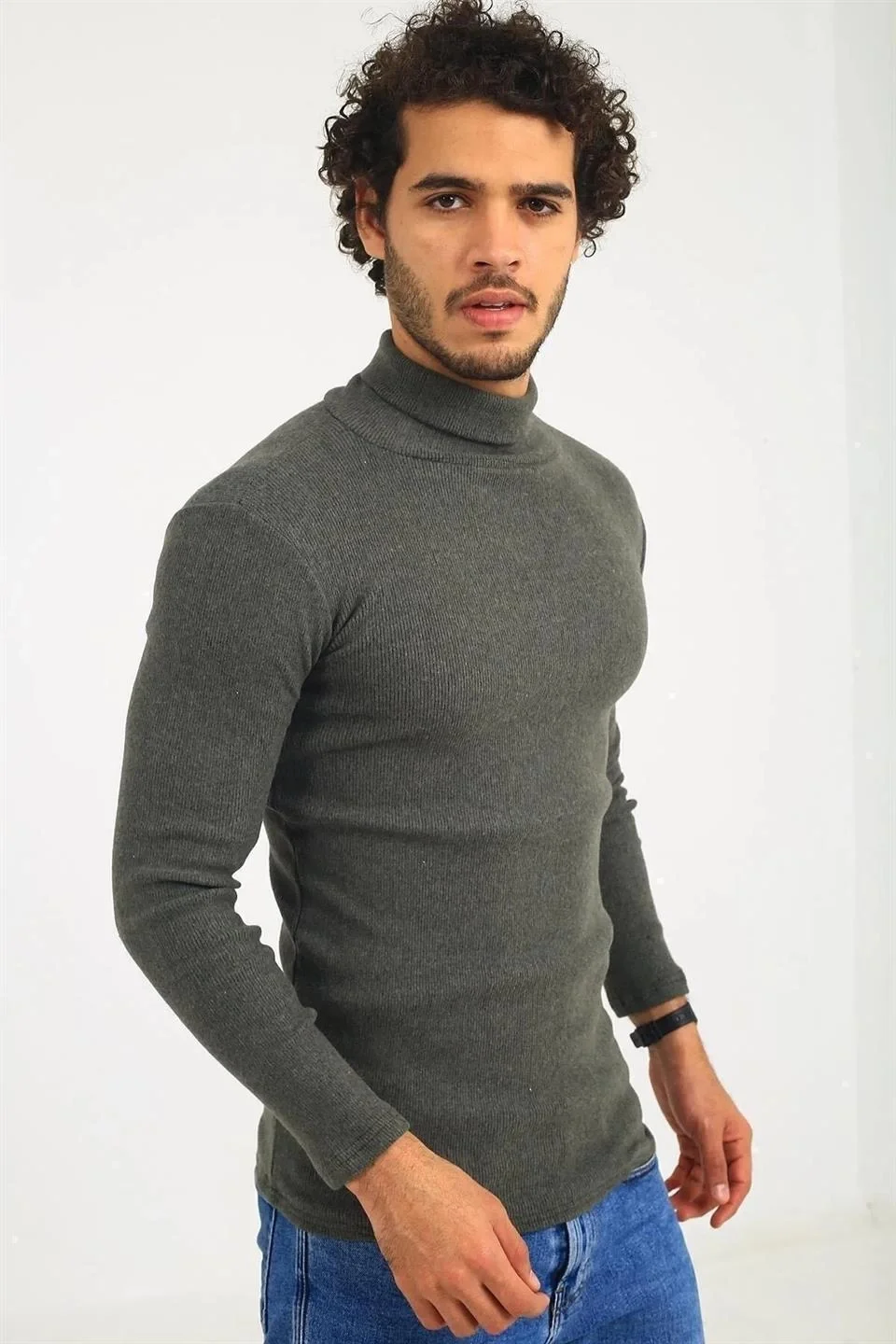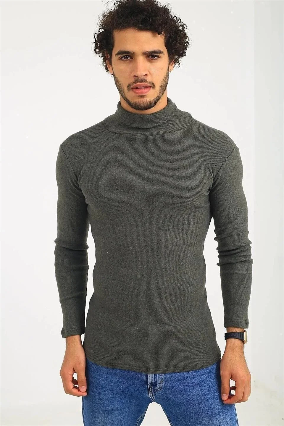 كنزة صوفية رجالية بياقة مدورة كاملة من الليكرا برقبة كاملة - كاكي