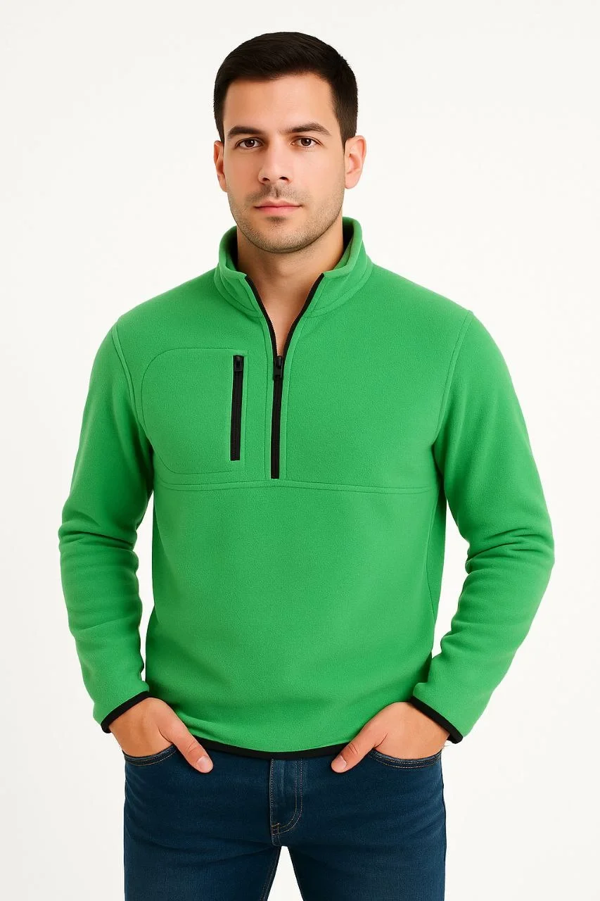 كنزة صوفية للرجال – ياقة قائمة، إغلاق بسحّاب نصفي، جيب صدر بسحاب، حواف سوداء على الصدر، موديل كاجوال كاجوال شتوي عادي – أخضر