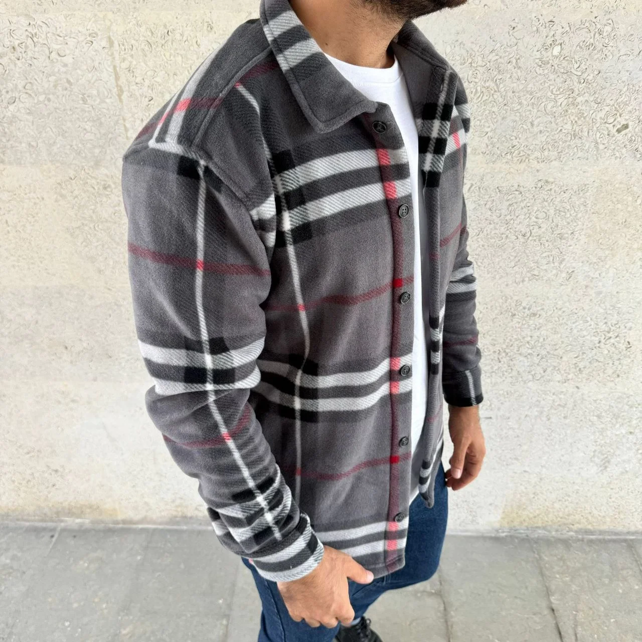 Erkek Ekose Desenli Düğmeli Polar Yakalı Uzun Kollu Gömlek Oversize Rahat Kalıp – Füme
