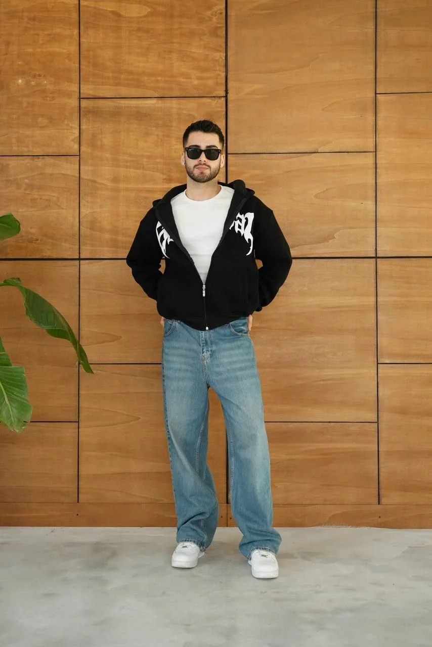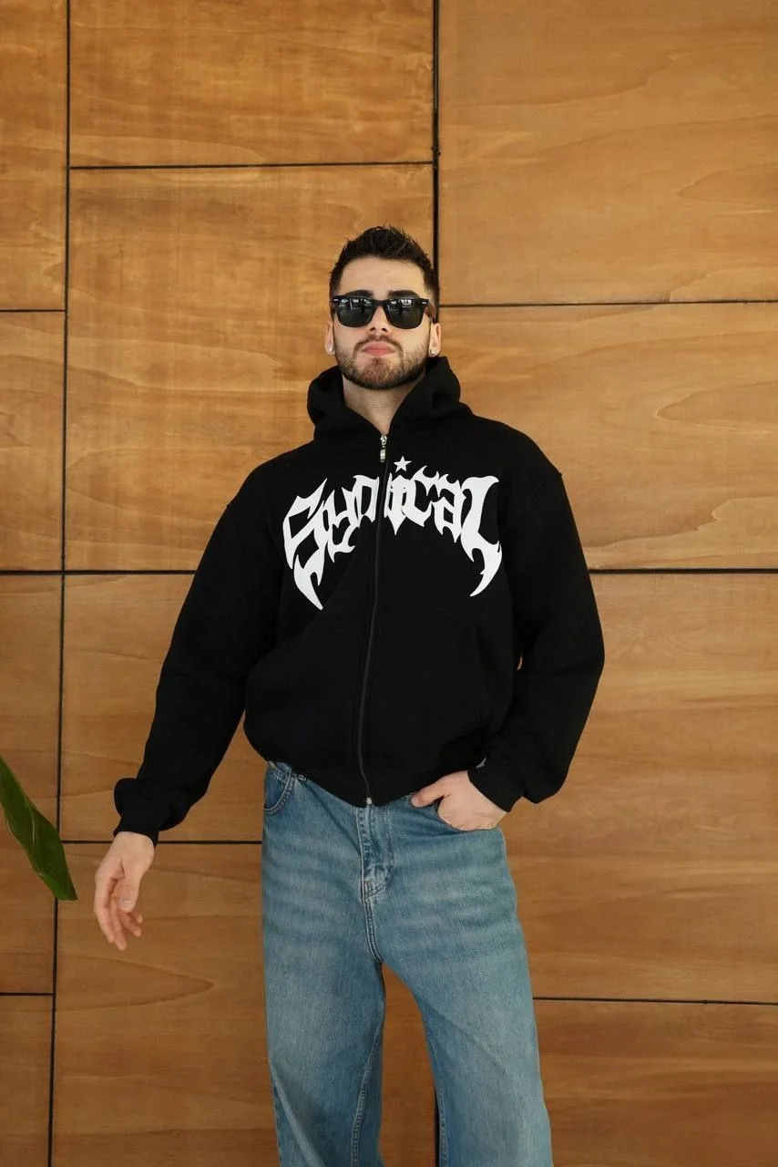 Erkek Kapüşonlu Sweatshirt Hoodie 3 İplik Şardonlu Pamuklu Kumaş, Önü Baskılı, Fermuarlı Rahat Kalıp, Kışlık ve Sokak Stili Sweat – Siyah