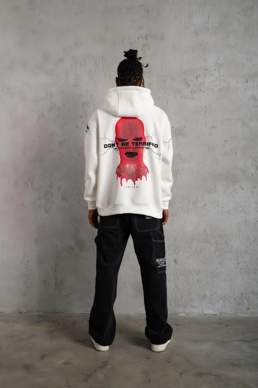 Erkek Oversize Üç İplik Kapüşonlu Sweatshirt – “Don’t Be Terrified” Ön, Sırt ve Kol Baskılı, Kanguru Cepli, Ribanalı Rahat Model – Beyaz