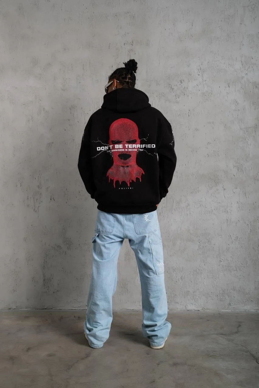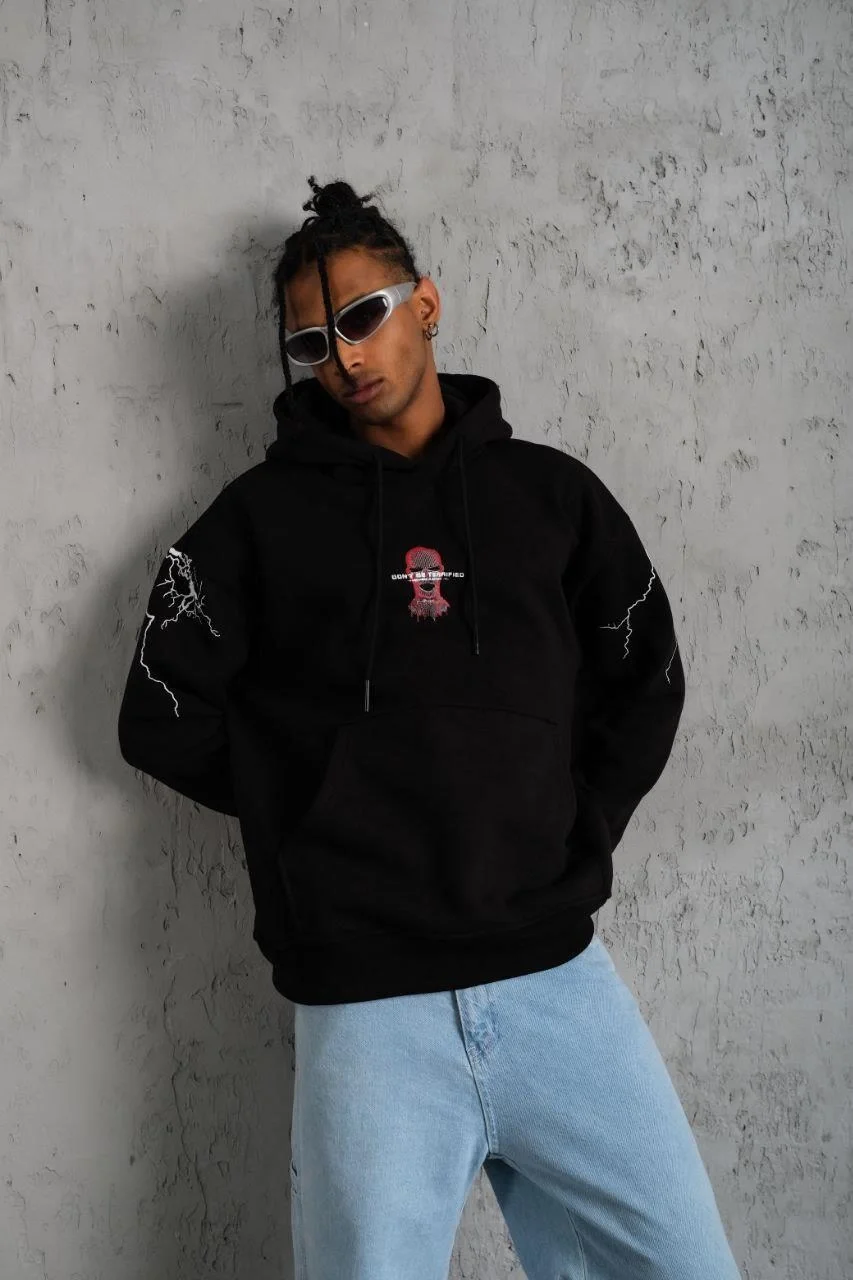 Erkek Oversize Üç İplik Kapüşonlu Sweatshirt – Siyah “Don’t Be Terrified” Ön, Sırt ve Kol Baskılı, Kanguru Cepli, Ribanalı Rahat Model- Siyah