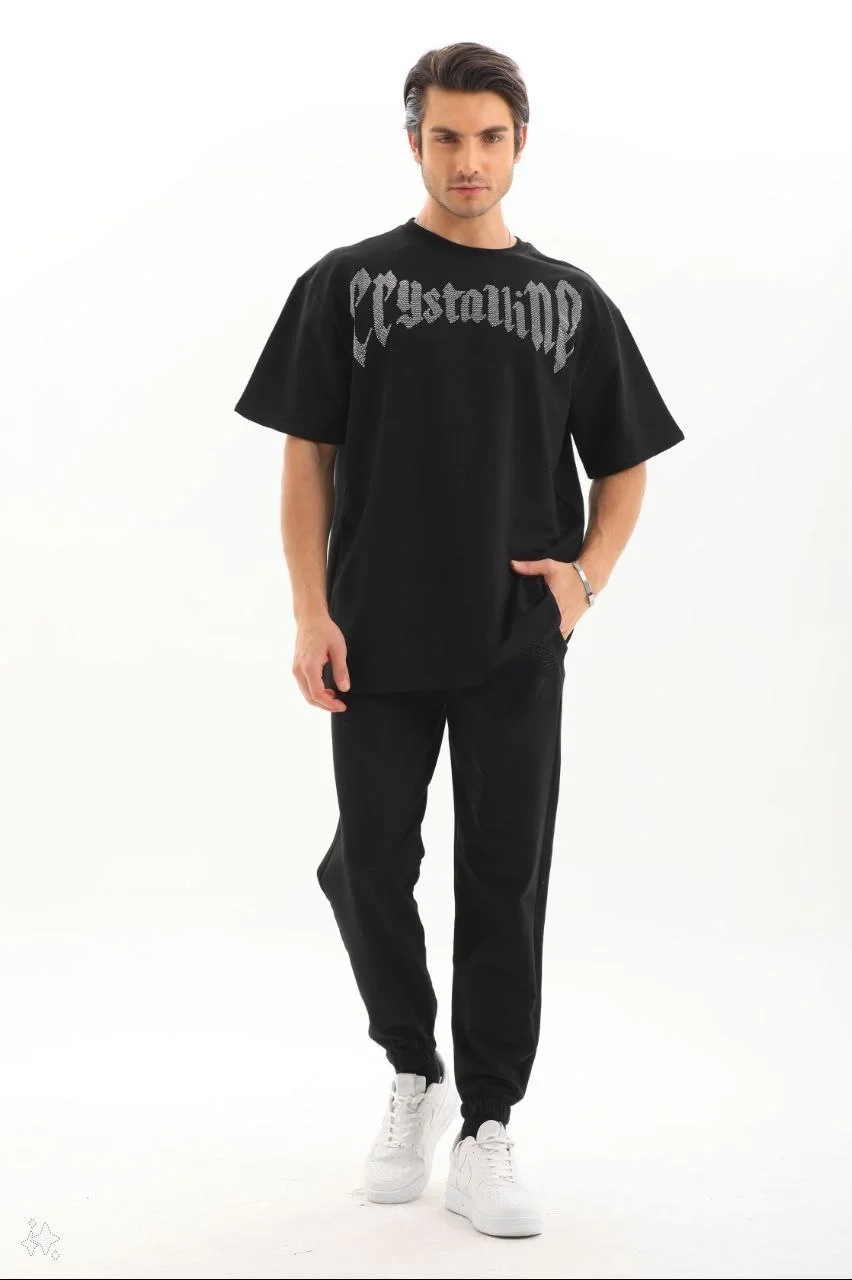 Unisex Oversize Taşlı T-Shirt – Siyah
