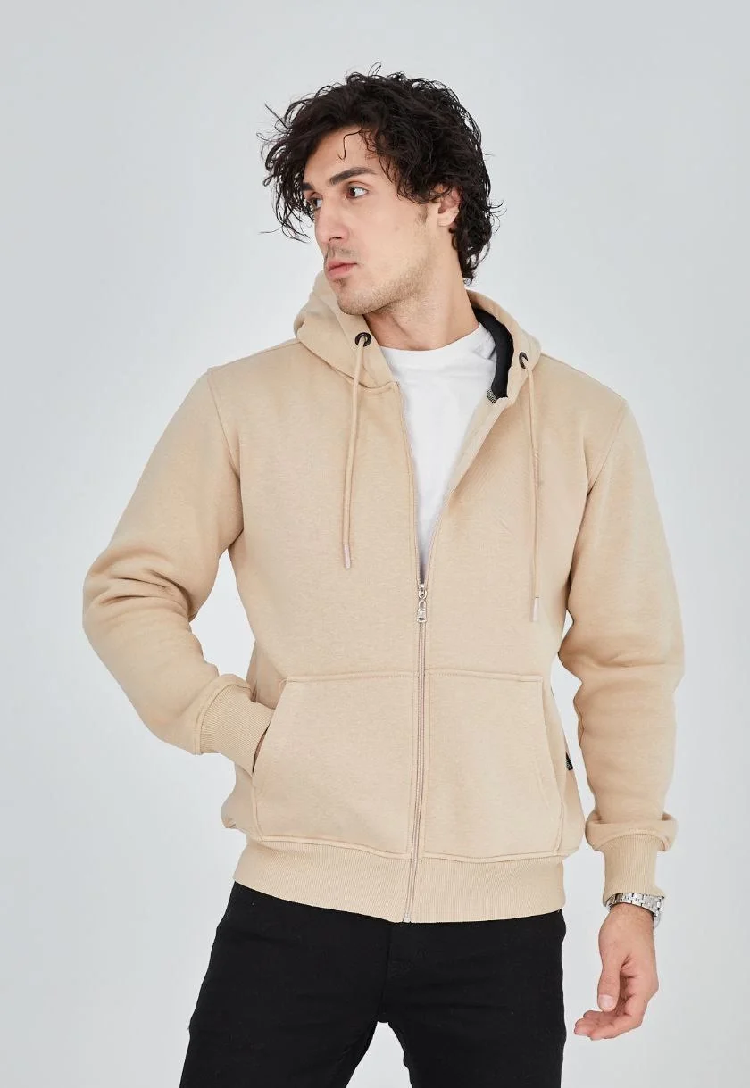 Unisex Tam Fermuarlı Kapşonlu SweatShirt – Bej